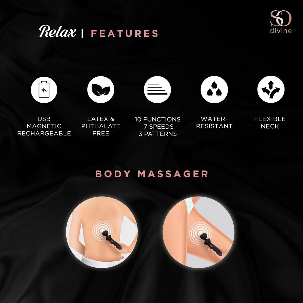 Существует ли игрушка, которая сможет радовать Ваше тело днем и ночью? Британская компания So Divine предлагает элегантный вибрационный массажер Relax Portable Massage Wand, который полностью справляется с этой непростой задачей. Этот эргономичный портативный вибромассажер обладает сверхмощной способностью фокусировать энергию на шее, спине, плечах и других частях тела.