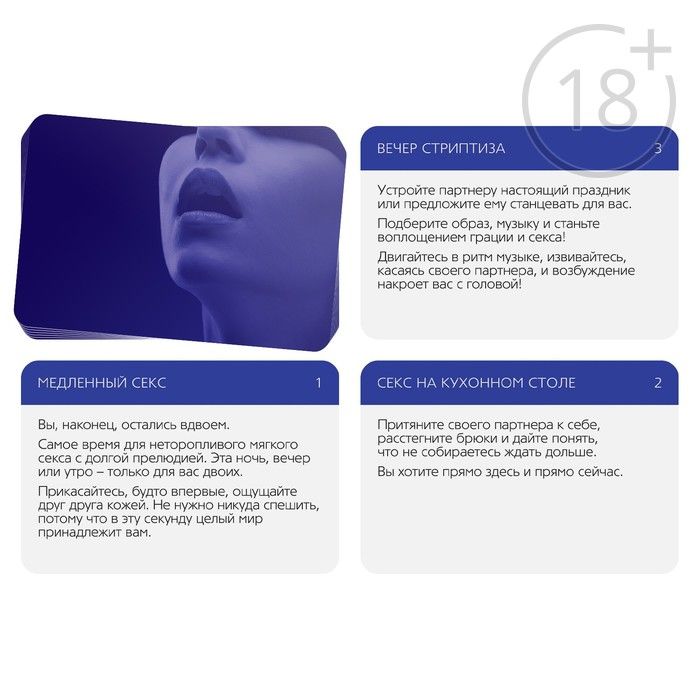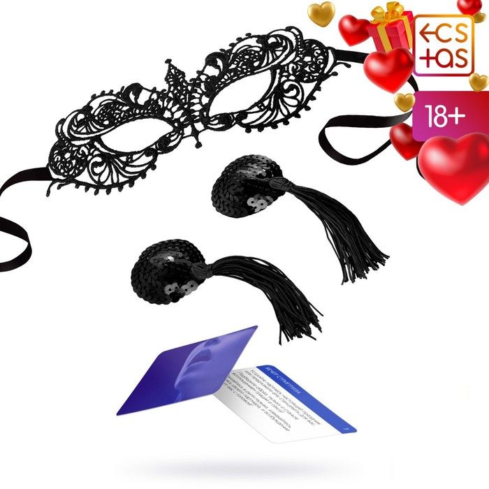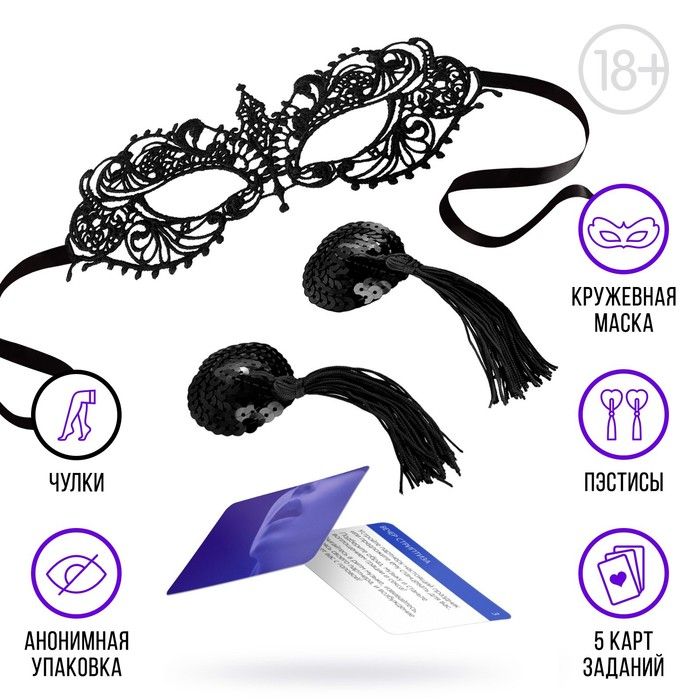 Пикантный секрет для вашего удовольствия. Этот набор позволит вам разнообразить сексуальную жизнь и добавить в неё немного перчинки. Вас ждут 5 карт с возбуждающими заданиями, а также чулки в сеточку, кружевная маска и пэстисы (специальные накладки на грудь). Что с этим делать? Да всё, что угодно. Главное, чтобы это принесло вам удовольствие! Прелесть набора заключается в анонимной упаковке. Ни один человек не догадается, сколько удовольствия прячется в маленьком пакете. Это будет только ваш секрет! В комплекте: чулки, маска, пэстисы, 5 карт.