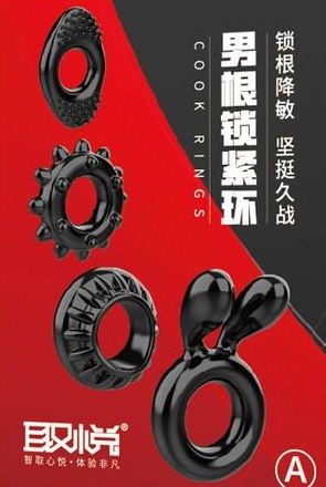 Набор из 4 черных эрекционных колец на пенис. В комплекте кольцо-бублик, кольцо с лучиками, вытянутое кольцо с щеточками и кольцо с ушками. Внутренний диаметр колец - 2 см.