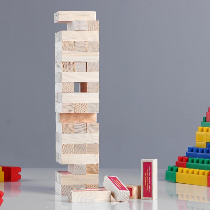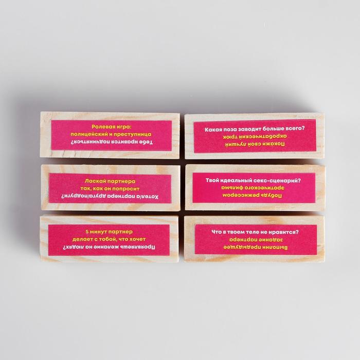 На каждом из брусков есть вопрос и задание - дерзкие, каверзные и откровенные, на грани между смущением и разоблачением. Если вы не можете ответить на вопрос, то вам придётся выполнить действие из задания. Также вам могут встретиться бруски со словом «Шанс»: в этом случае вы сами можете придумать вопрос или задание сопернику. В комплекте: 54 бруска, правила игры.