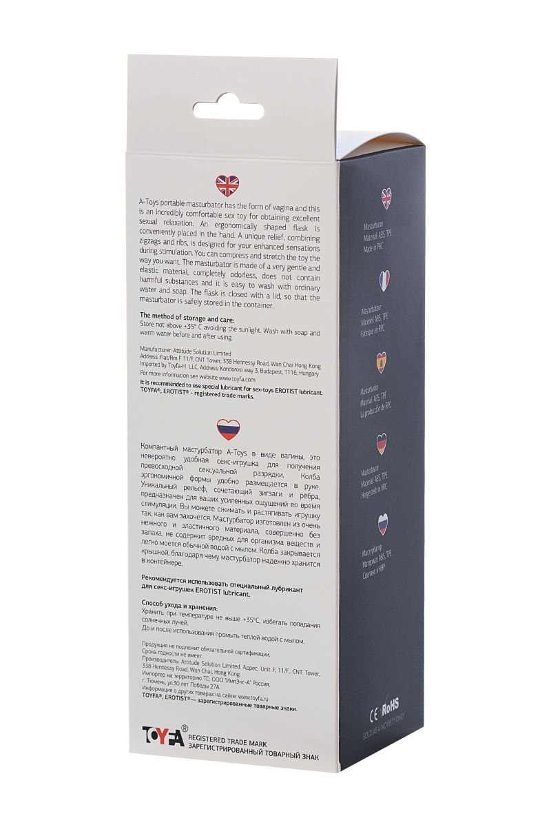 Мастурбатор-вагина A-Toys в колбе имеет компактный размер, что позволяет использовать его в любых условиях – дома, в отеле или на природе. Он легко помещается в кармане или сумке, что делает его удобным для транспортировки.